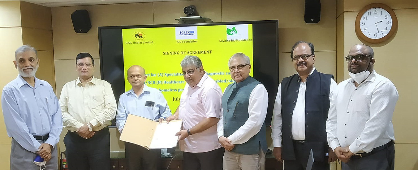 An agreement was signed between M/s GAIL India Ltd. and M/s Suvidha Bio Foundation along with IOD Foundation (Implementing Project MOU partner) on 12.07.2021 at GAIL HQO, for the conduct of specialized medical diagnostic camps and Healthcare support for disabled/old age homeless people at Delhi/NCR to be supported under GAIL CSR. The agreement was signed by the GAIL team in the august presence of Director Marketing Shri. E. S. Ranganathan and Director Finance, Shri. A. K. Tiwari and represented by Shri. Reji Mathew, Secretary General, IOD Foundation. The project falls under the commitment of GAIL CSR towards Health as one of the primary focus areas of CSR interventions, the bouquet of which has been appositely termed GAIL Hriday.